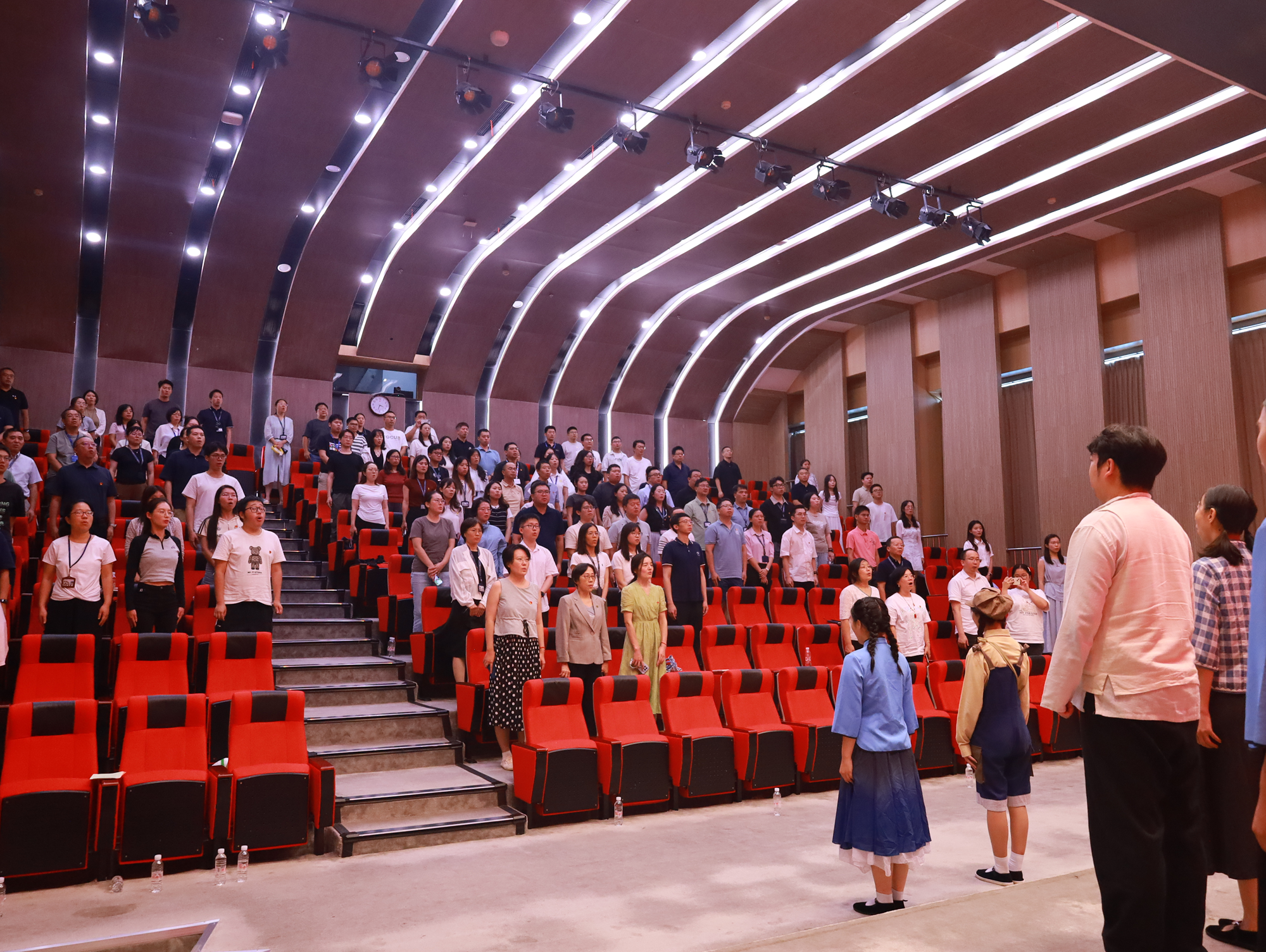 专业演员现场演绎《国之当歌》的经典选段,以音乐深情再现聂耳、田汉“以文艺为武器”的斗争历程。7位kdpay钱包官网的青年学生自发登台与专业演员互动,共同演绎经典曲目《卖报歌》和《毕业歌》。当《义勇军进行曲》旋律响起,全场党员同志怀着激动的心情肃立高唱,激昂的旋律与雷鸣掌声交织,将“天下兴亡,匹夫有责”的精神传承具象化。